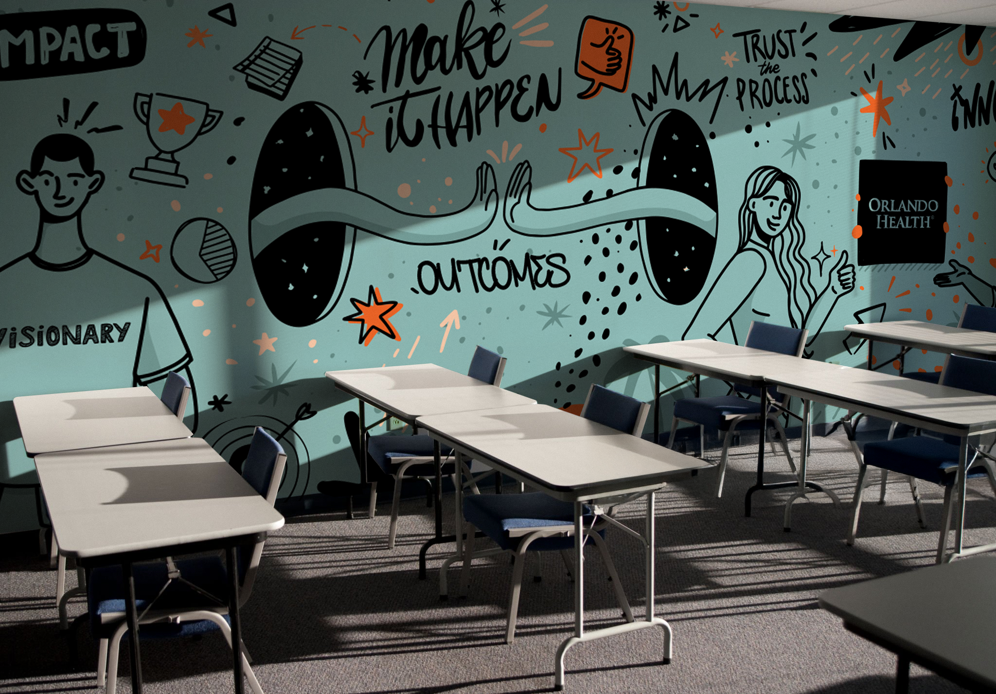 I worked with Orlando Health and the University of Central Florida to create the visual identity for a new campus floor for future medical students. I used an existing color palette to develop a fun and cohesive design based on hand-drawn doodles and positive messages. I illustrated original characters and graphics to energize and inspire. I created designs for a large classroom wall, a lobby entrance wall, as well as two large word clouds to highlight themes of collaboration, growth, and purpose. The goal was to make the space feel vibrant, youthful, and encouraging. The final result builds a sense of community while supporting the next generation of healthcare professionals.
